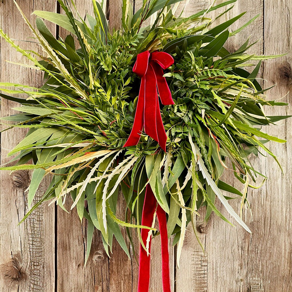 A sumptuous Christmas door wreath in beautiful shades of red. The addition of the delicious large red roses add a truly decadent touch while the snow dusted large berries work wonderfully with the glittered burgundy seed heads. The frosted pine cones, fresh dark green Christmas foliage, and ivy seed heads bring this show stopping wreath together. Finished with a luxurious velvet ribbon adornment in dark red and black.